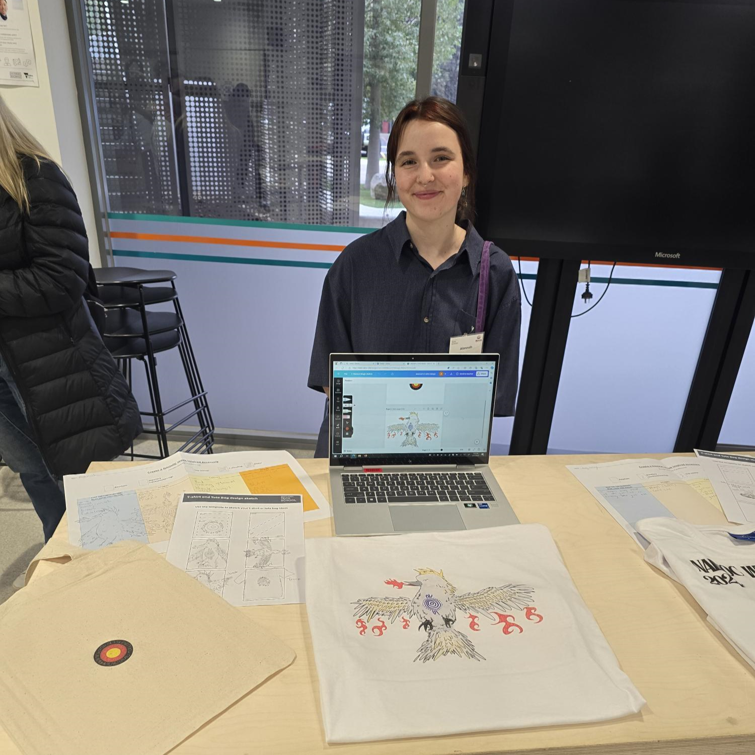 With the support of the Tech School, students had the opportunity to use digital design software and technologies such as laser cutting, garment printing, and sticker printing to create t-shirts, tote bags, accessories, and stickers showcasing their designs.